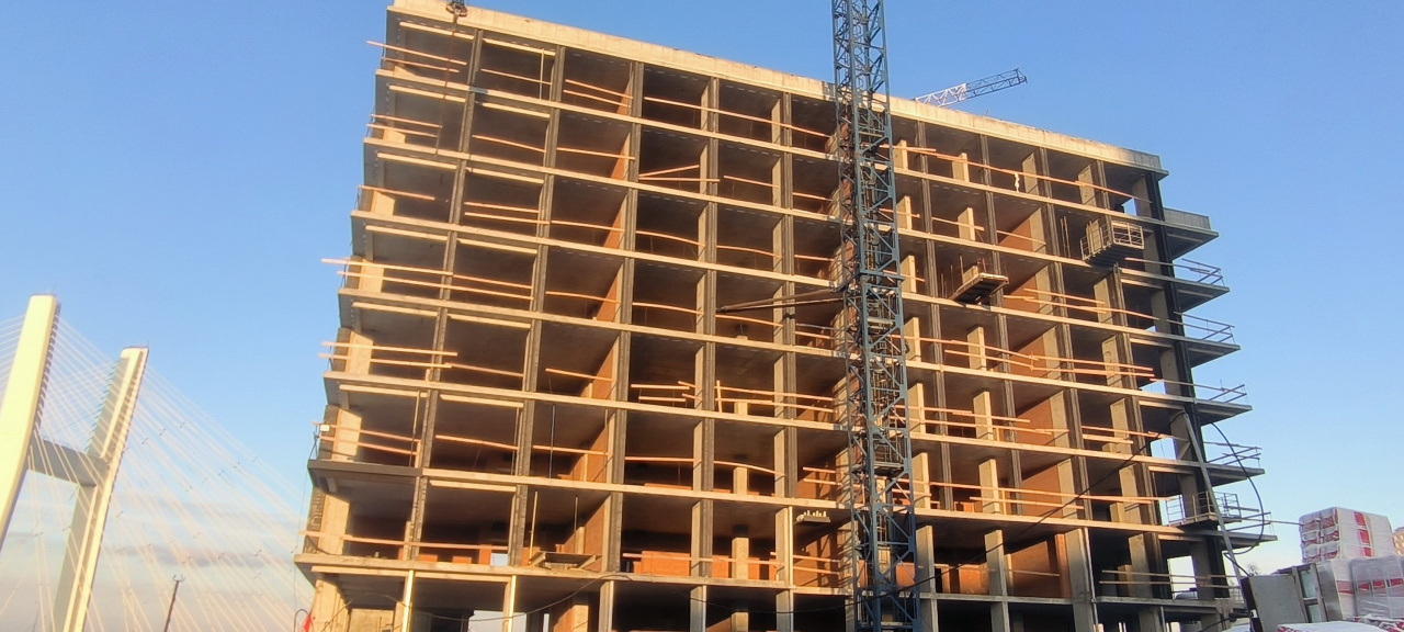 Проливные дожди в июле в почти ежедневном режиме сопровождали строительные работы по 4-й очереди квартала. Однако, здание растет, и на фоне голубого неба, и особенно, на фоне узнаваемых пилонов Центрального моста выглядит безусловным претендентом на новый открыточный вид города. Фото этого здания в будущем и виды из окон этого здания будут одинаково завораживающими!
