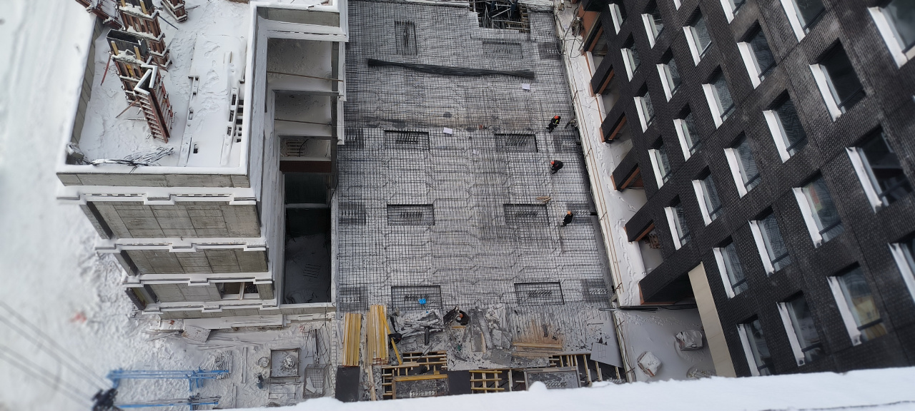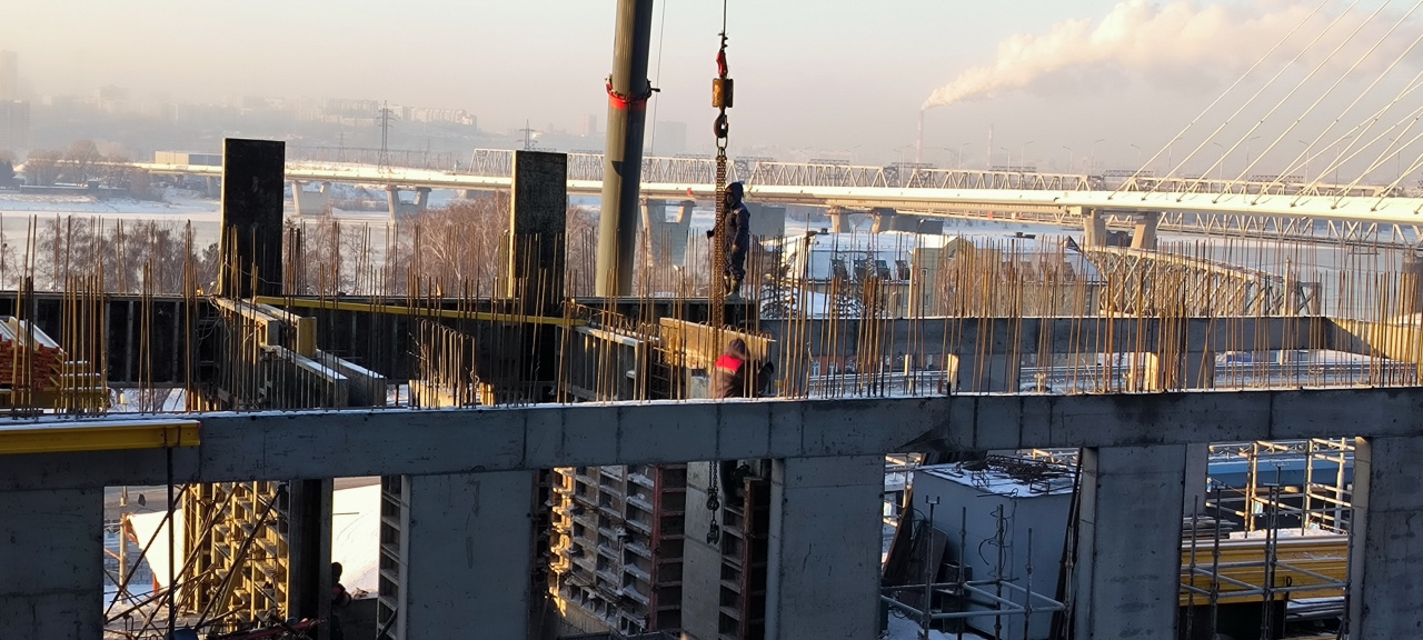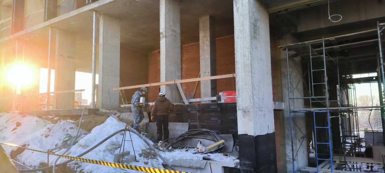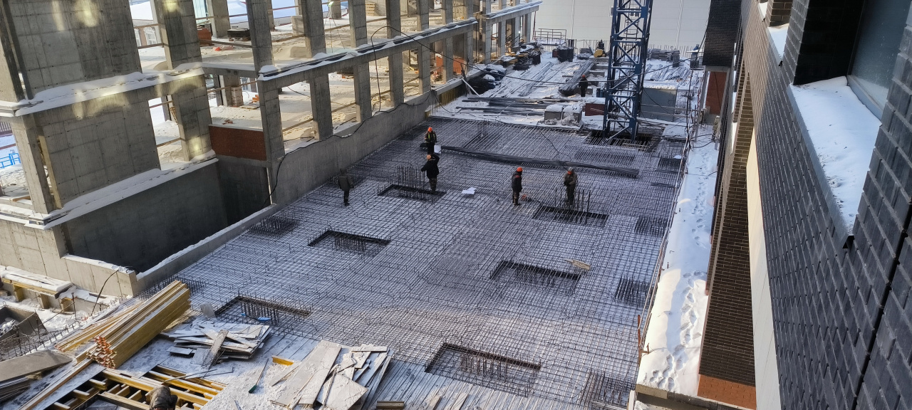 В здании, словно в улье, все жужжит и мгновенно меняется — кипит работа в десятках направлений: идет установка вентиляционных коробов, прокладка трасс кондиционирования, сварка, герметизация стыков, монтаж электрики, установка окон. А также продолжается поднятие монолитного каркаса здания и кирпичная кладка.