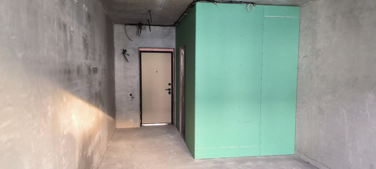 СТЕНЫ: Кирпичные. Межкомнатные перегородки из гипсокартонных листов по металлическому каркасу. Кирпичная стена оштукатурена, ошпатлевана. Наружная стена окрашена, остальные — покрыты декоративной штукатуркой. В санузле — облицованы керамогранитом.